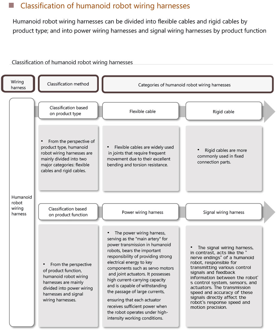 بناءً على نوع المنتج، يمكن تصنيف أحزمة الأسلاك الروبوتية البشرية إلى كابلات مرنة وكابلات صلبة؛ بناءً على وظيفة المنتج، يمكن تصنيفها إلى أحزمة طاقة وأحزمة إشارة.