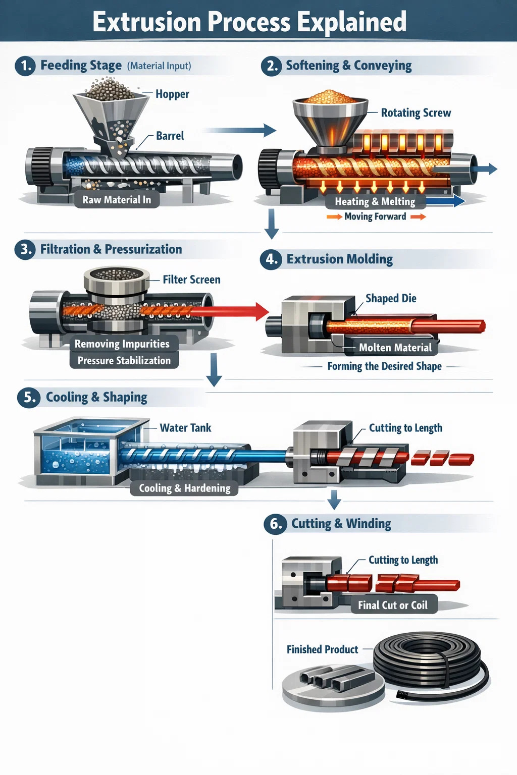 أخيرًا، يتم تقطيع المنتج النهائي المتصلب تلقائيًا إلى أقسام أو لفه في ملف، بشكل مشابه للسلك الكهربائي، وبالتالي إكمال دورة كاملة من تشغيل آلة البثق.