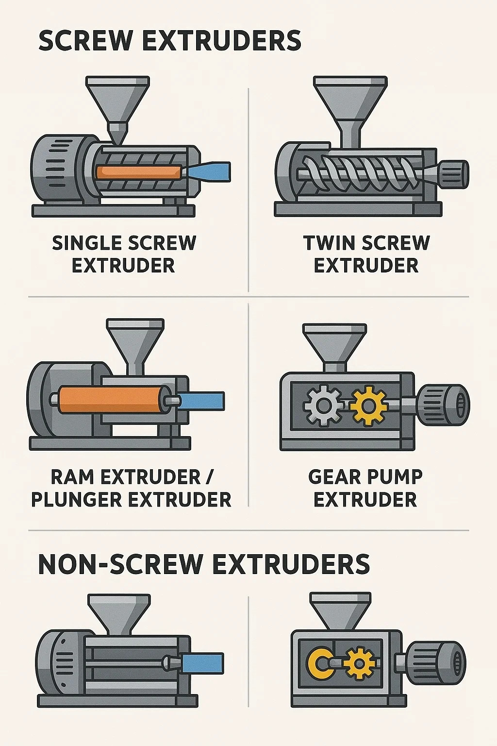 في مجالات مثل البلاستيك والمعادن وتصنيع الأغذية، آلات البثق يمكن تصنيفها بشكل أساسي إلى الفئات التالية بناءً على مبادئ عملها وبنيتها: