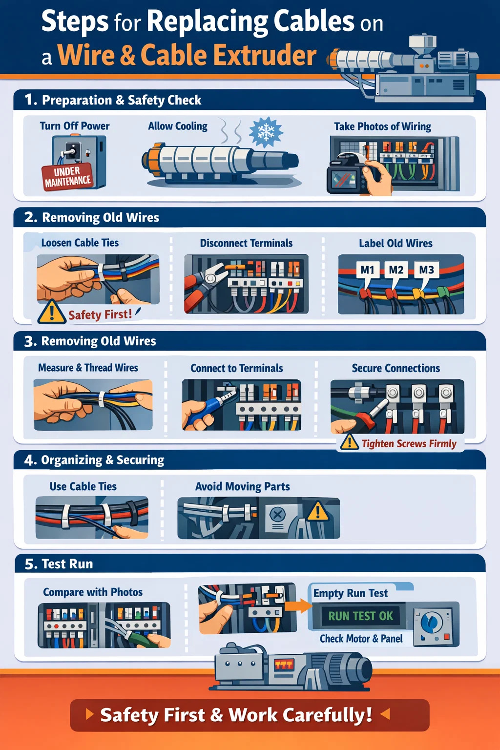 فيما يلي خطوات استبدال الكابلات الموجودة على جهاز آلة بثق الأسلاك والكابلات :