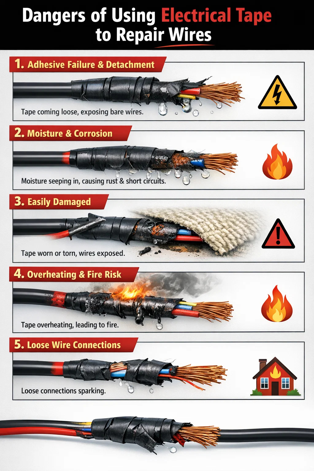 على الرغم من أن الشريط الكهربائي يمكن أن يكون منقذًا للحياة في حالات الطوارئ، إلا أن استخدامه لإصلاح الأسلاك التالفة على المدى الطويل يشكل في الواقع العديد من مخاطر السلامة.