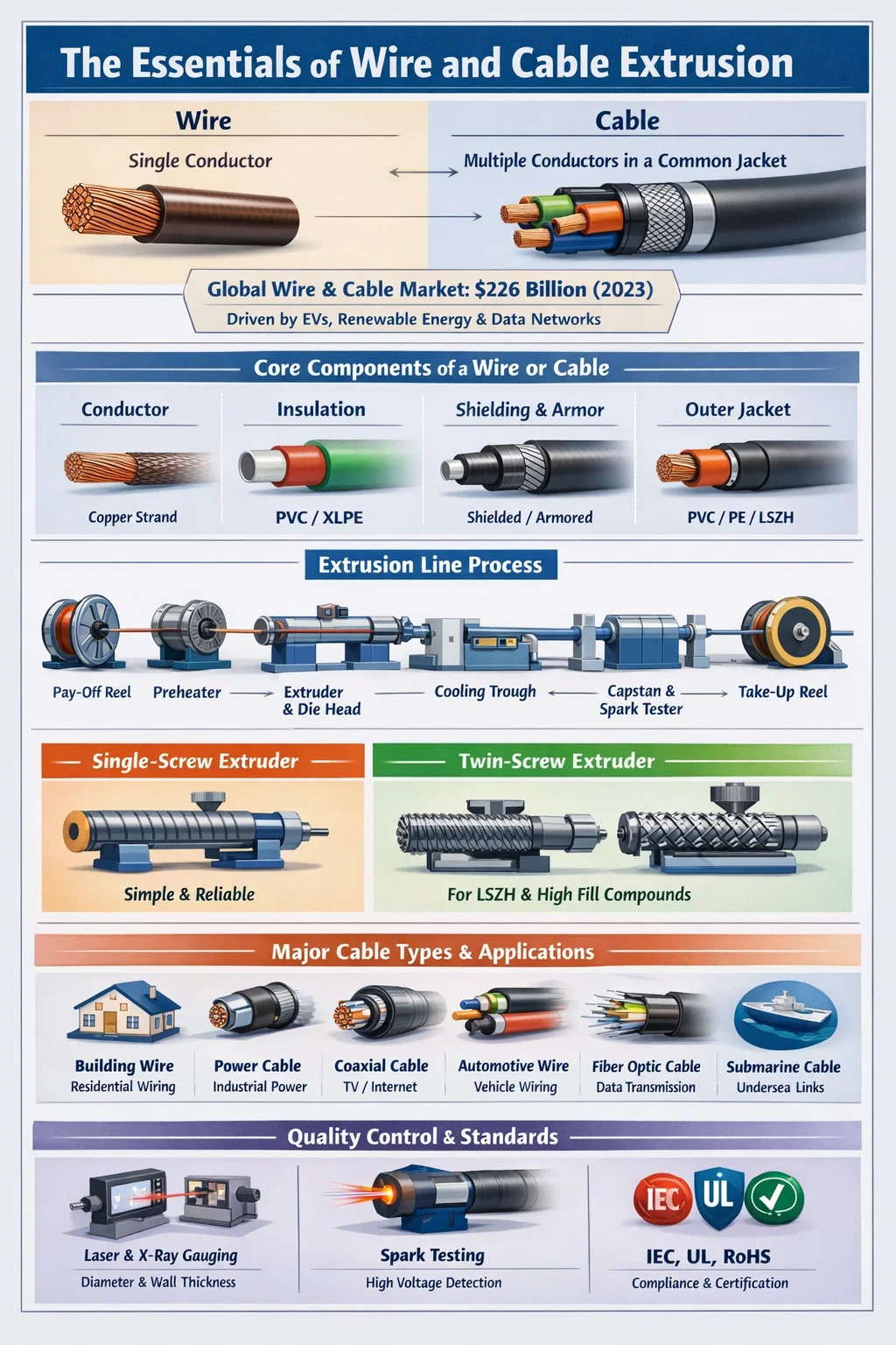 إن آلة بثق الأسلاك والكابلات هي القطعة المركزية من المعدات في خط الإنتاج. وتتمثل وظيفتها الأساسية في تطبيق العزل أو التغليف أو طبقات البوليمر الأخرى على الموصل عن طريق صهر مادة اللدائن الحرارية أو المواد المتصلدة بالحرارة ودفعها عبر قالب حول السلك بسرعة عالية. بدون جهاز بثق تم تكوينه بشكل صحيح، من المستحيل تحقيق سمك جدار ثابت، والتصاق جيد، والخصائص الميكانيكية التي تتطلبها معايير مثل IEC 60228، أو UL 44، أو RoHS.