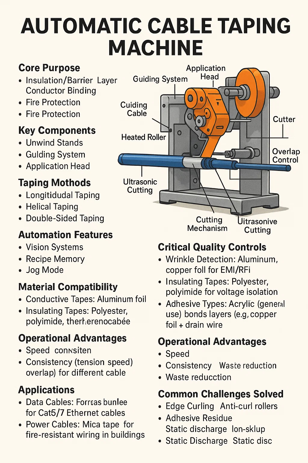 ان ماكينة ربط الكابلات الأوتوماتيكية تطبق الأشرطة أو الأفلام المدعومة باللاصق على الكابلات بدقة أثناء الإنتاج. وفيما يلي تفصيل لوظيفتها وميزاتها: