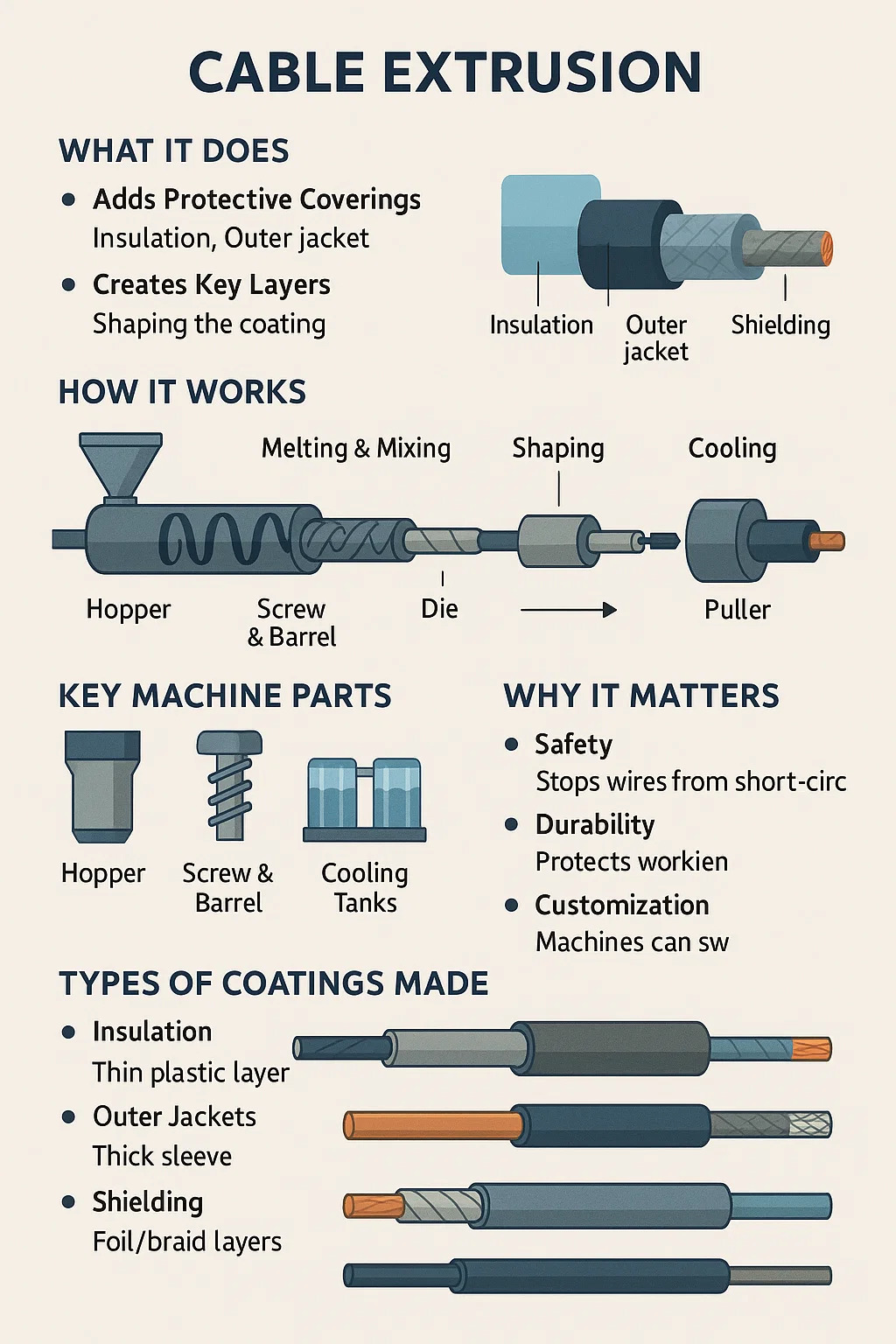 • يضيف أغطية واقية: يذيب المواد البلاستيكية أو المطاطية لتكوين طبقة ناعمة ومتساوية حول الأسلاك المعدنية.